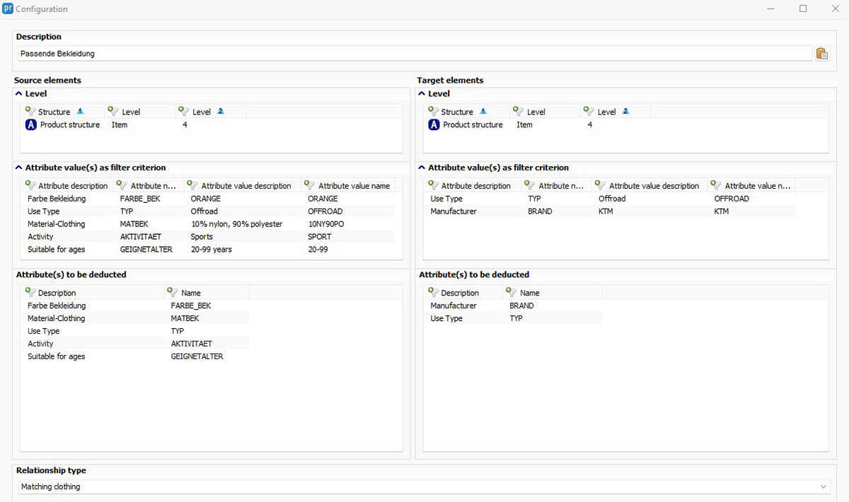Example 2 "Suitable clothing": The selection of suitable clothing for a motorcycle depends on various criteria. These include properties such as color, material or type of use of the clothing. These are defined at the source element (clothing). Automatic referencing only takes place if the corresponding characteristics such as manufacturer and type of use of the motorcycle are maintained on the target element (motorcycle). This condition means that all orange jackets made of materials for off-road use are automatically referenced to all motorcycles that are from manufacturer X and are designed for off-road use.